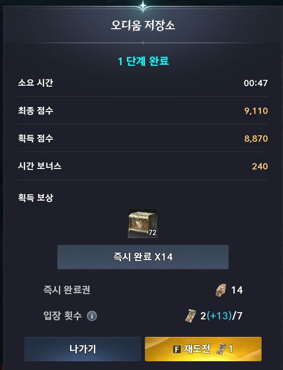 한번 클리어 한뒤에 그 보상 횟수를 14번 보상을 얻어내는거다 보니 최대보상을 얻을수 있는 부캐로 즉시완료권을 구매하시는게